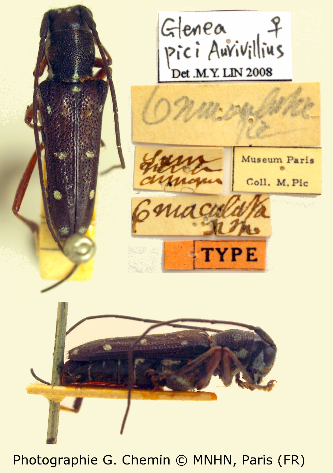Glenea 6-maculata Pic Specimen Type: holotype © MNHN Institution: MNHN Museum of Natural History Paris, France Photographer: Gerard Chemin, Cerambycoidea Forum Collection Location: Annam, Vietnam 102451