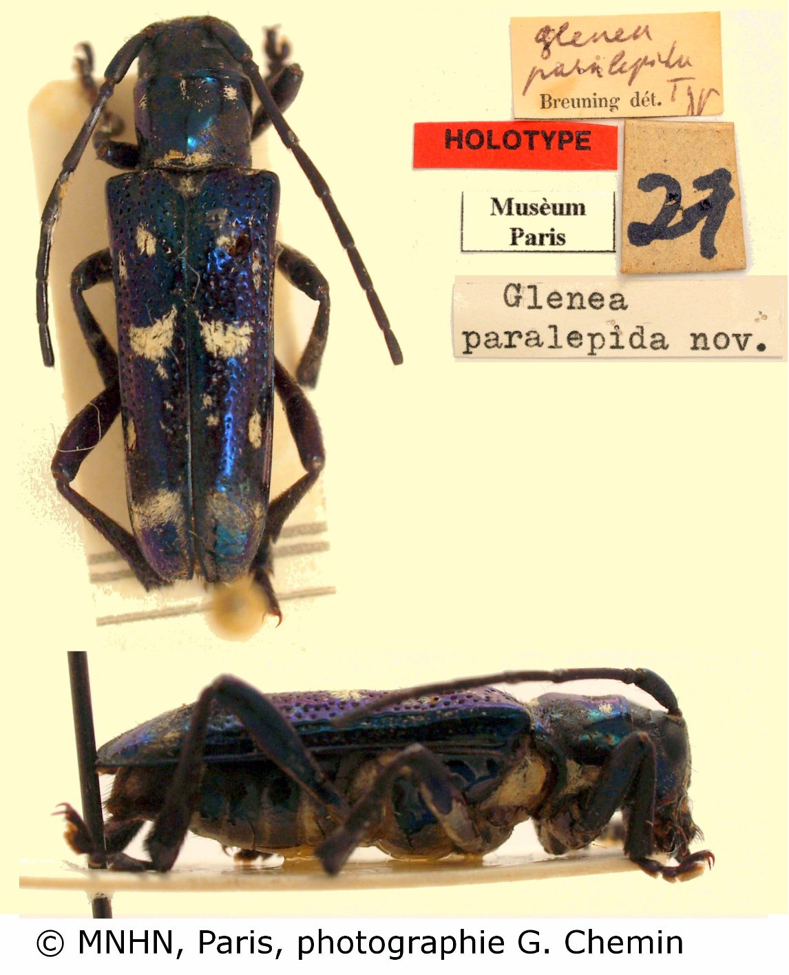 Glenea paralepida Breuning Specimen Type: holotype © MNHN Sex: f Institution: MNHN Museum of Natural History Paris, France Photographer: Gerard Chemin, Cerambycoidea Forum Collection Location: Mindanao, Philippines 102522
