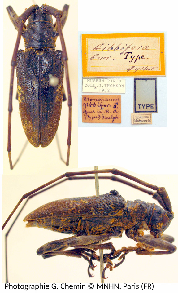 Monochamus gibbifera Guerin-Meneville Specimen Type: holotype © MNHN Sex: m Institution: MNHN Museum of Natural History Paris, France Photographer: Xavier Gouverneur, Cerambycoidea Forum Collection Location: Tamil Nadu, India 102639
