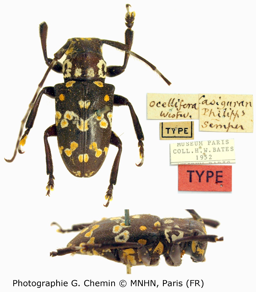 Lamia ocellifera Westwood Specimen Type: holotype © MNHN Sex: f Institution: MNHN Museum of Natural History Paris, France Photographer: Gerard Chemin, Cerambycoidea Forum Collection Location: Ilagon, Luzon, Philippines 102581