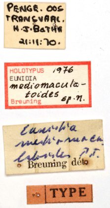 Eunidia mediomaculatoides Breuning Specimen Type: holotype Institution: TMSA Ditsong: National Museum of Natural History, Pretoria, South Africa Photographer: Michael Bate Collection Location: Penge, E Transvaal, South Africa 90136