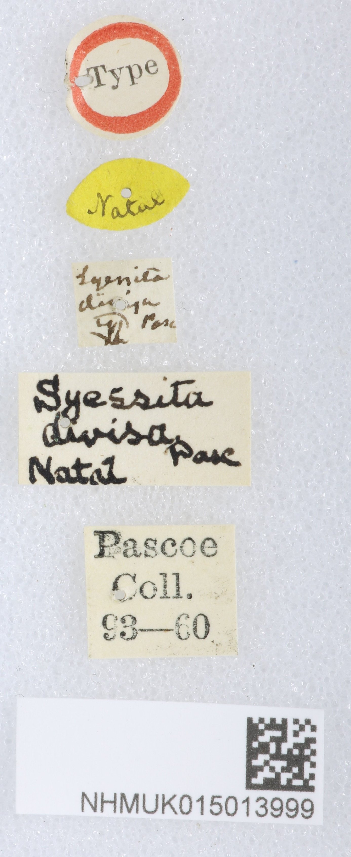 Syessita divisa Pascoe Specimen Type: holotype Institution: BMNH British Museum Natural History, London, UK Photographer: Keita Matsumoto Collection Location: Natal, South Africa 79602