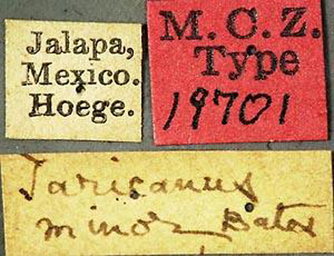 Taricanus minor Bates Specimen Type: syntype Institution: MCZ Museum of Comparative Zoology, Harvard University, Cambridge, MA, USA Photographer: P. Naskrecki, P. Perkins, and B. Farrell Collection Location: Jalapa, Mexico 18681