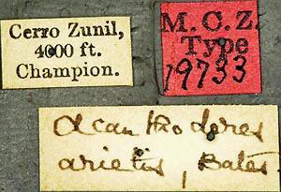 Acanthoderes arietis Bates Specimen Type: syntype Institution: MCZ Museum of Comparative Zoology, Harvard University, Cambridge, MA, USA Collection Location: Cerro Zunil, Quetzaltenango, Guatemala 14894