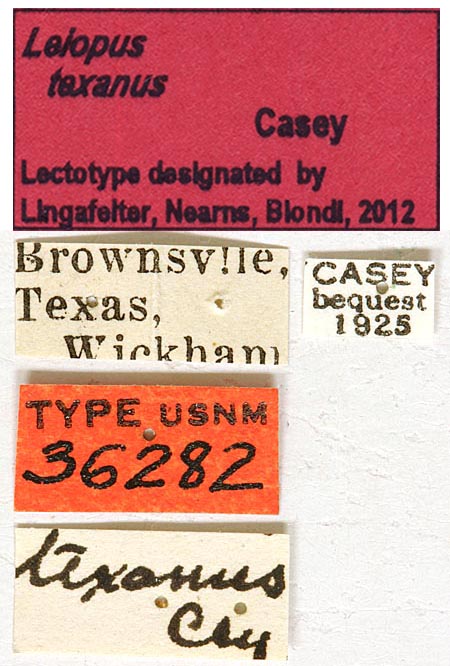 Leiopus texanus Casey Specimen Type: lectotype Institution: NMNH United States National Museum, Washington, DC, USA Photographer: Steve Lingafelter Collection Location: Brownsville, Cameron County, Texas 40086
