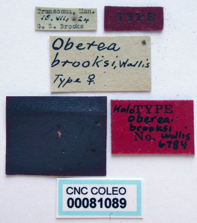 Oberea brooksi Wallis Specimen Type: holotype Sex: f Institution: CNC Canadian National Collection of Insects, Ottawa, Ontario, Canada Photographer: Serge Laplante, photograph and data Determiner: Copyright of