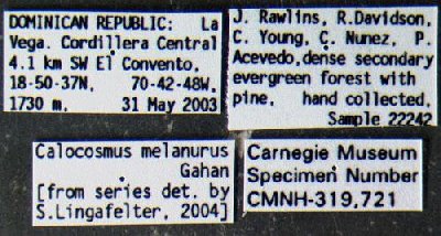 Institution: CMNH Carnegie Museum of Natural History, Pittsburgh, PA, USA Photographer: P. Naskrecki, P. Perkins, and B. Farrell Determiner: Lingafelter Collection Location: La Vega, Dominican Republic 24834