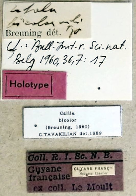 Estola bicolor Breuning Specimen Type: holotype Sex: m Institution: IRSNB Royal Belgian Institute of Natural Sciences, Brussels, Belgium Photographer: A. Drumont & J. Lalanne Collection Location: New Chantier, Saint-Laurent-du-Moroni, French Guiana 79300