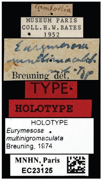 Eurymesosa multinigromaculata Breuning Specimen Type: holotype Sex: f Institution: MNHN Museum of Natural History Paris, France Photographer: Christophe Rivier Collection Location: Cambodia 90869