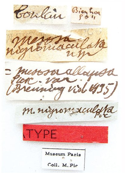 Mesosa nigromaculata Pic Specimen Type: holotype Sex: f Institution: MNHN Museum of Natural History Paris, France Photographer: Xavier Gouverneur Collection Location: Hoa-Binh Tonkin, Vietnam 90872