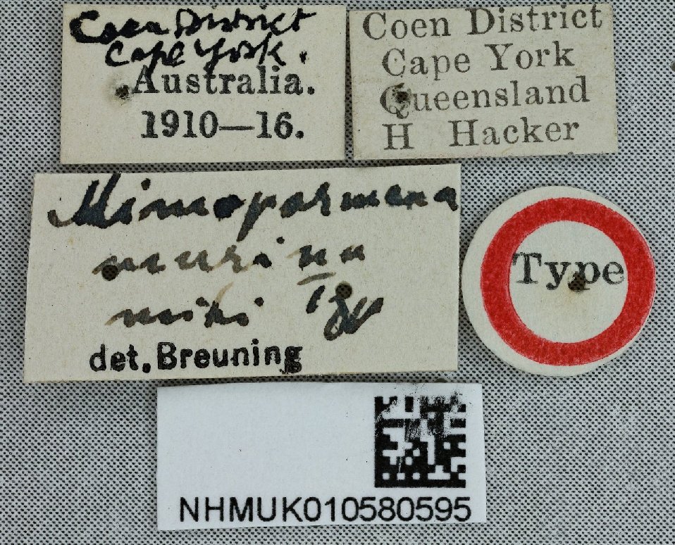 Mimoparmena murina Breuning Specimen Type: holotype Institution: BMNH British Museum Natural History, London, UK Photographer: Keita Matsumoto Collection Location: Cape York, Queensland, Australia 65901