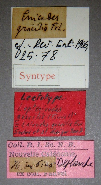 Enicodes gracilis Fauvel Specimen Type: lectotyp ©IRSNB Sex: m Institution: IRSNB Royal Belgian Institute of Natural Sciences, Brussels, Belgium Photographer: Camille Locatelli Collection Location: Isle of Pines, New Caledonia 77612