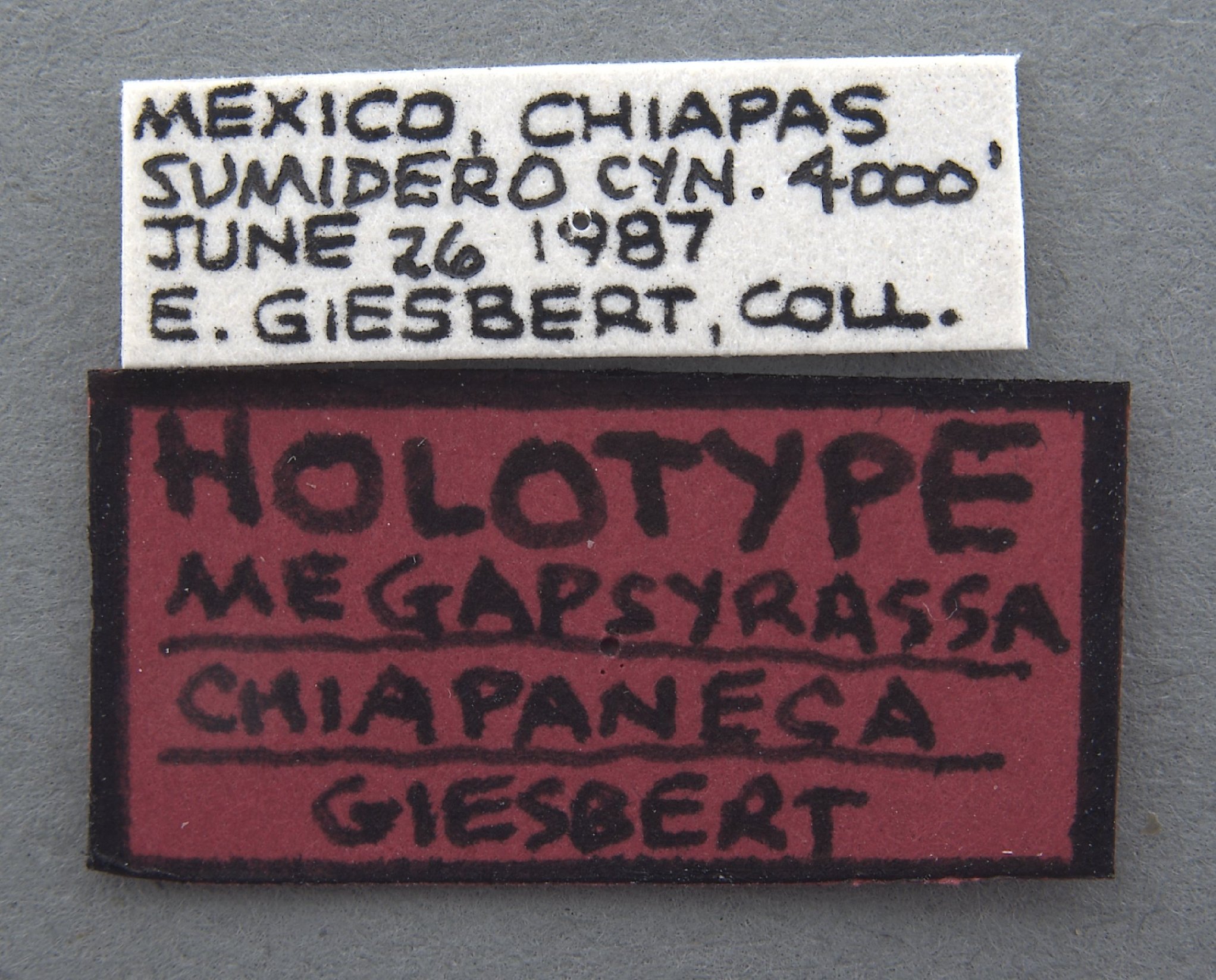 Megapsyrassa chiapaneca Giesbert Specimen Type: holotype Sex: m Institution: CAS California Academy of Sciences, San Francisco, CA, USA Photographer: Rachel Diaz-Bastin Collection Location: Sumidero Canyon, Chiapas, Mexico 69357