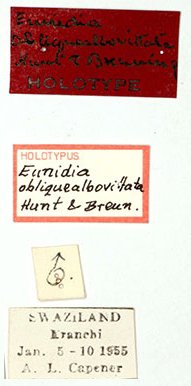 Eunidia obliquealbovittata Hunt & Breuning Specimen Type: holotype Sex: m Institution: TMSA Ditsong: National Museum of Natural History, Pretoria, South Africa Photographer: Michael Bate Collection Location: Eranchi, Swaziland (Eswatini) 90137