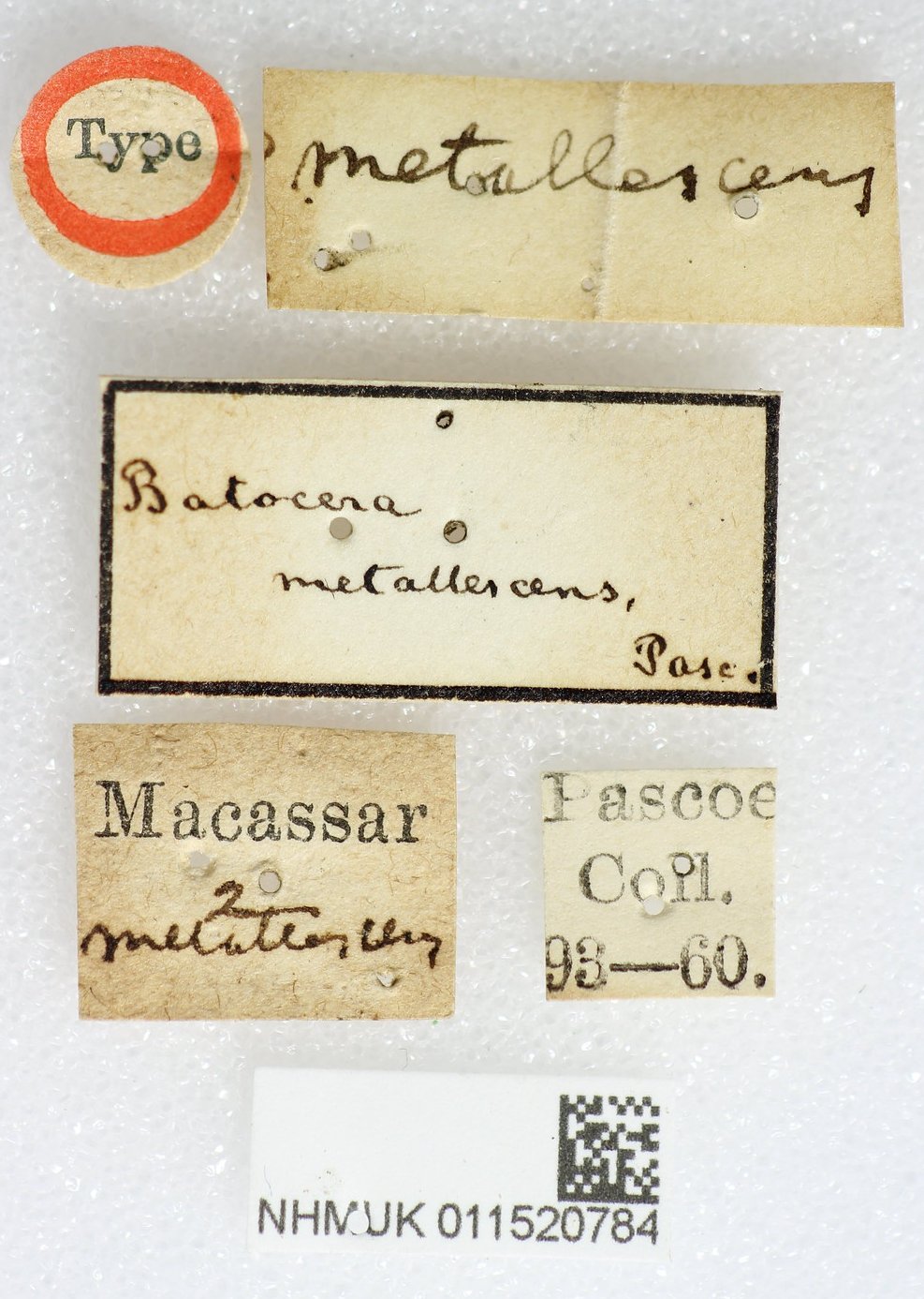 Batocera celebiana metallescens Pascoe Specimen Type: holotype Institution: BMNH British Museum Natural History, London, UK Photographer: Keita Matsumoto Collection Location: Macassar, Greater Sunda Islands, Sulawesi 72983