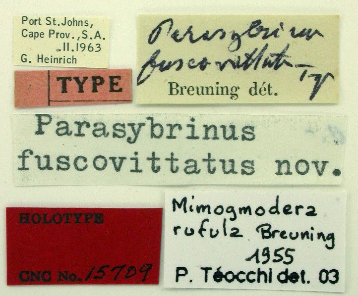 Parasybrinus fuscovittatus Breuning Specimen Type: holotype Institution: CNC Canadian National Collection of Insects, Ottawa, Ontario, Canada Photographer: Serge Laplante, photograph and data Determiner: Copyright of