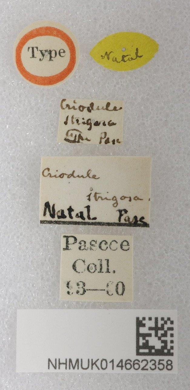 Criodule strigata Pascoe Specimen Type: syntype Institution: BMNH British Museum Natural History, London, UK Photographer: Keita Matsumoto Collection Location: Natal, South Africa 79094