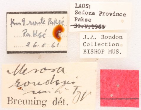 Mesosa rondoni Breuning Specimen Type: holotype Sex: m Institution: BPBM Bernice P. Bishop Museum, Honolulu, Hawaii, USA Photographer: Nobuo Ohbayashi Collection Location: Vientiane, Laos 44685