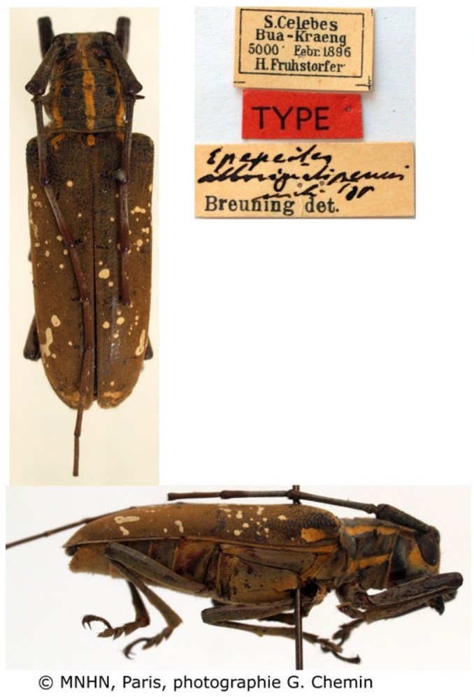 Epepeotes pictus albosignatipennis Breuning Specimen Type: holotype © MNHN Institution: MNHN Museum of Natural History Paris, France Photographer: Gerard Chemin Collection Location: Bua-Kraeng, S Sulawesi, Indonesia 77169