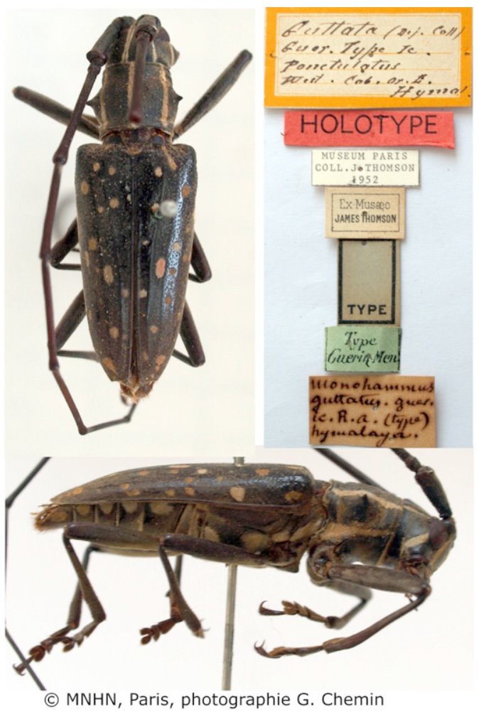 Monohamus guttatus Guerin-Meneville Specimen Type: holotype © MNHN Sex: m Institution: MNHN Museum of Natural History Paris, France Photographer: Gerard Chemin Collection Location: India (Himalayan Mountains) 77200