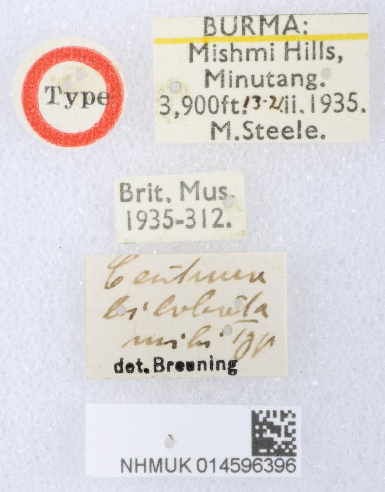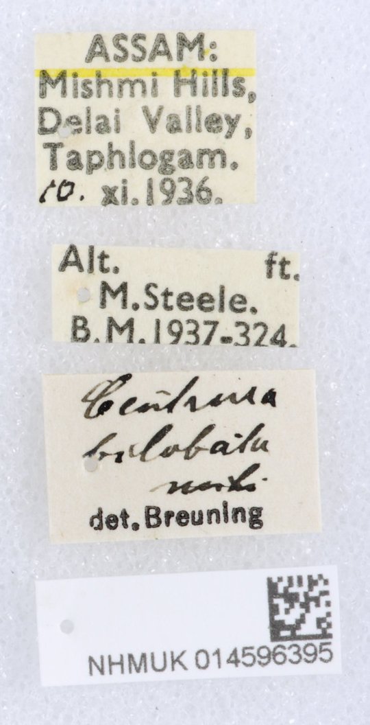 Centrura bilobata Breuning Specimen Type: syntype Institution: BMNH British Museum Natural History, London, UK Photographer: Keita Matsumoto Collection Location: Taphlogam, Delai valley, Mishmi-Hills, Myanmar 80959