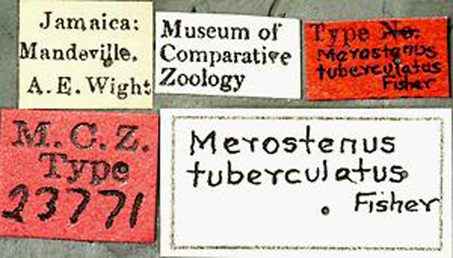 Merostenus tuberculatus Fisher Specimen Type: holotype Sex: f Institution: MCZ Museum of Comparative Zoology, Harvard University, Cambridge, MA, USA Collection Location: Mandeville, Jamaica 17389