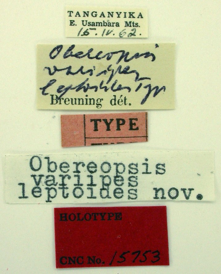 Oberea variipes leptoides Breuning Specimen Type: holotype Institution: CNC Canadian National Collection of Insects, Ottawa, Ontario, Canada Photographer: Serge Laplante, photograph and data Determiner: Copyright of