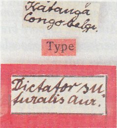 Dictator suturalis Aurivillius Specimen Type: holotype Sex: f Institution: ZSM Zoologische Staatssammlung, München, Germany Photographer: Pierre Juhel Collection Location: Gambas, Angola 79017