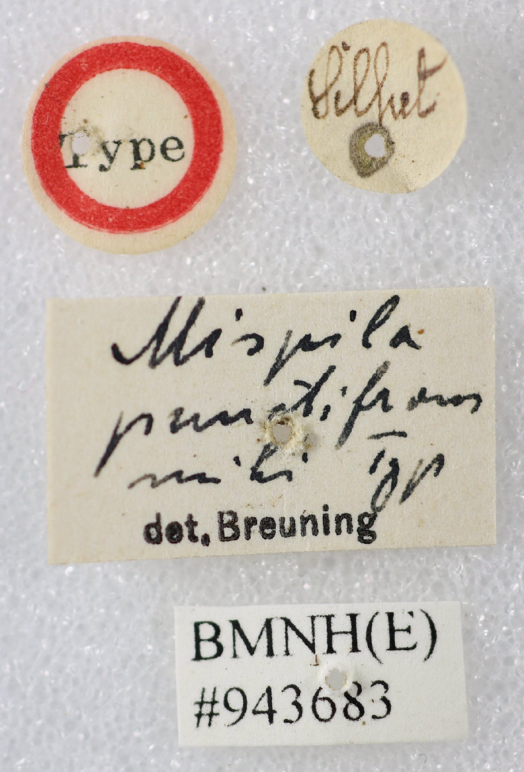 Mispila punctifrons Breuning Specimen Type: holotype Sex: f Institution: BMNH British Museum Natural History, London, UK Photographer: Keita Matsumoto Collection Location: Sylhet, Chittagong, Bangladesh 90095