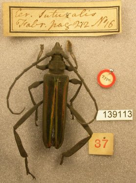Cerambyx suturalis Fabricius Specimen Type: holotype Institution: HMUG United Kingdom, Glasgow, Glasgow University, Hunterian Museum Photographer: JS Moure Collection Location: America Meridionali 100528