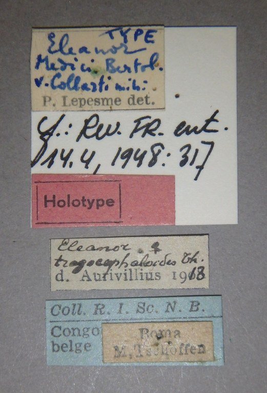 Eleanor medici var collarti Lepesme Specimen Type: holotype ©IRSNB Sex: f Institution: IRSNB Royal Belgian Institute of Natural Sciences, Brussels, Belgium Photographer: Camille Locatelli Collection Location: Boma, RD Congo 77342