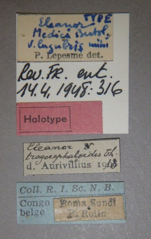 Eleanor medici var collarti Lepesme Specimen Type: holotype ©IRSNB Sex: f Institution: IRSNB Royal Belgian Institute of Natural Sciences, Brussels, Belgium Photographer: Camille Locatelli Collection Location: Boma, RD Congo 77344