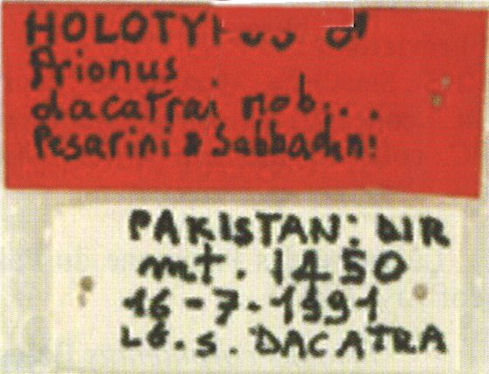 Prionus dacatrai Pesarini & Sabbadini Specimen Type: holotype Sex: m Institution: CCPAS Collection C. Pesarini & A. Sabbadini, Milan, Italy Determiner: Il Naturalista Valtellinese Collection Location: Mt Dir, Pakistan 57555