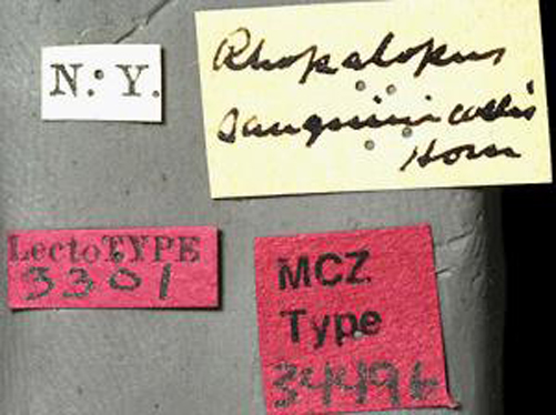 Euryoptera sanguinicollis Horn Specimen Type: holotype Institution: MCZ Museum of Comparative Zoology, Harvard University, Cambridge, MA, USA Photographer: P. Naskrecki, P. Perkins, and B. Farrell 1192