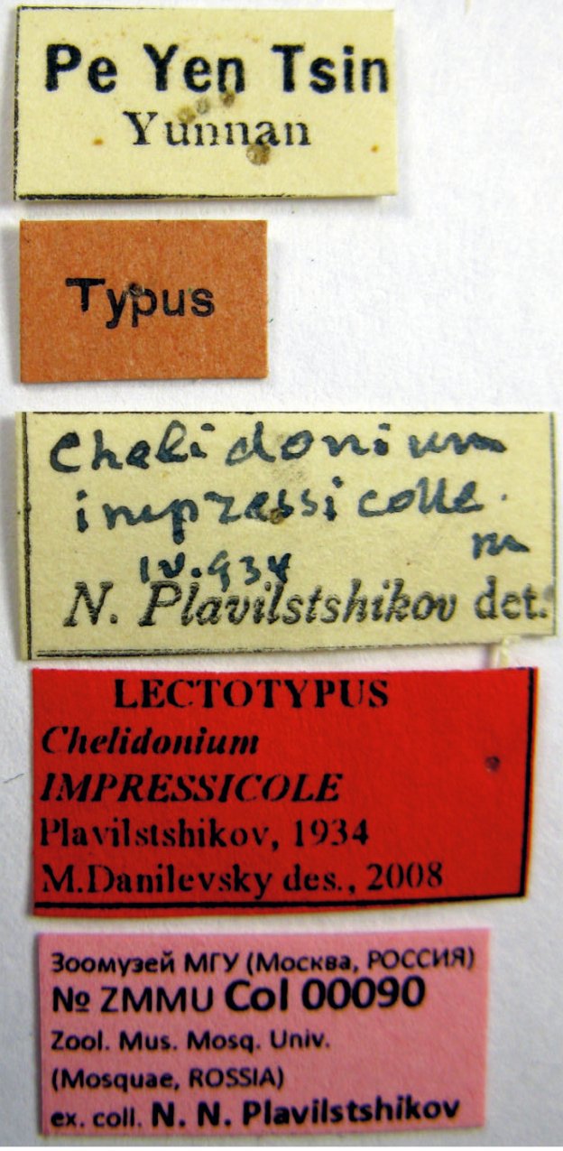 Chelidonium impressicolle Plavilstshikov Specimen Type: lectotype Sex: f Institution: ZMUM Zoological Museum, University of Moscow Photographer: A Gusakov Collection Location: Pe Yen Sin, Yunnan, China 73711