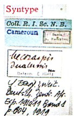 Mecosaspis dualensis Hintz Specimen Type: syntype Institution: IRSNB Royal Belgian Institute of Natural Sciences, Brussels, Belgium Determiner: Les Cahiers Collection Location: Douala, Cameroon 52162