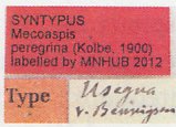 Mecothyrea peregrina Kolbe Specimen Type: lectotype Sex: m Institution: ZMHB Museum für Naturkunde der Humboldt-Universität, Berlin, Germany Photographer: Pierre Juhel Collection Location: Mhonda, Tanzania 74880