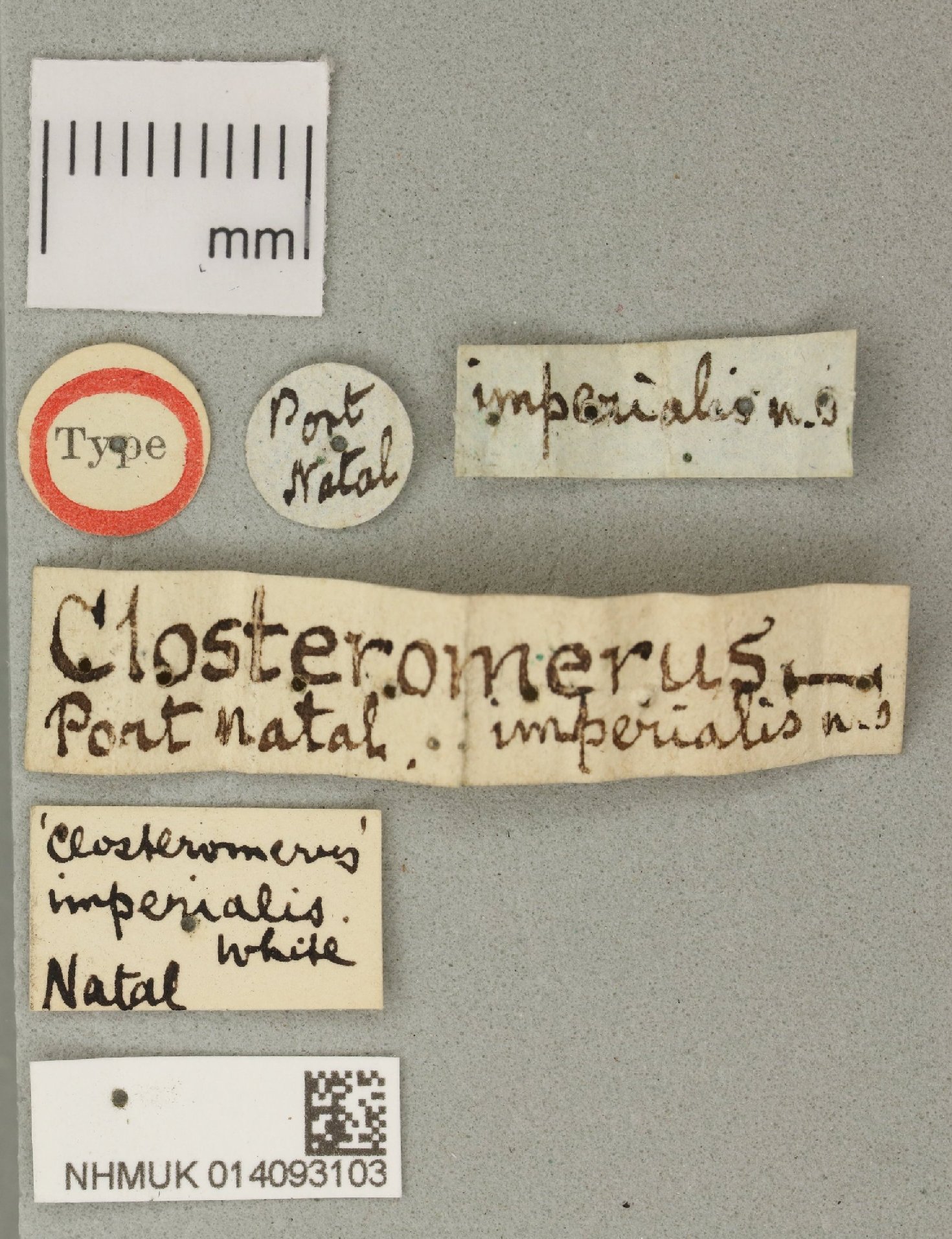 Closteromerus imperialis White Specimen Type: holotype Institution: BMNH British Museum Natural History, London, UK Photographer: Peter Wing Collection Location: Durban, KwaZulu-Natal, South Africa 70169