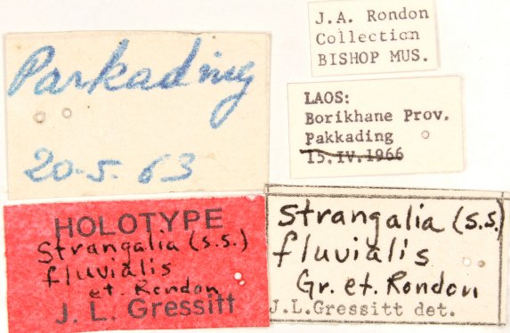 Strangalia fluvialis Gressitt & Rondon Specimen Type: holotype Sex: f Institution: BPBM Bernice P. Bishop Museum, Honolulu, Hawaii, USA Photographer: Nobuo Ohbayashi Collection Location: Pakkading, Laos 45436