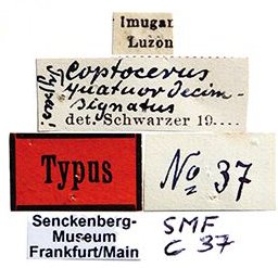 Coptocercus quatuordecimsignatus celebensis Schwarzer Specimen Type: holotype Institution: SMF Senckenberg Research Institute and Natural History Museum Frankfurt, Germany Collection Location: N Sulawesi 58918