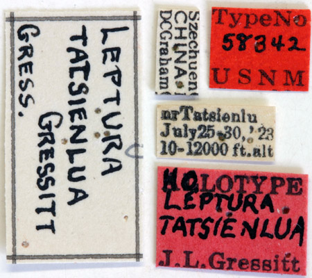 Leptura tatsienlua Gressitt Specimen Type: holotype Sex: f Institution: NMNH United States National Museum, Washington, DC, USA Photographer: Steve Lingafelter Collection Location: near Tatsienlu, Kangding County, Sichuan Province, China 51806