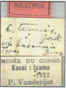 Specimen Type: lectotype Sex: m Institution: MRAC Musée Royal de l'Afrique Centrale de Tervuren, Belgium Photographer: Pierre Juhel Collection Location: Ipamu Kasai, RD Congo 73922