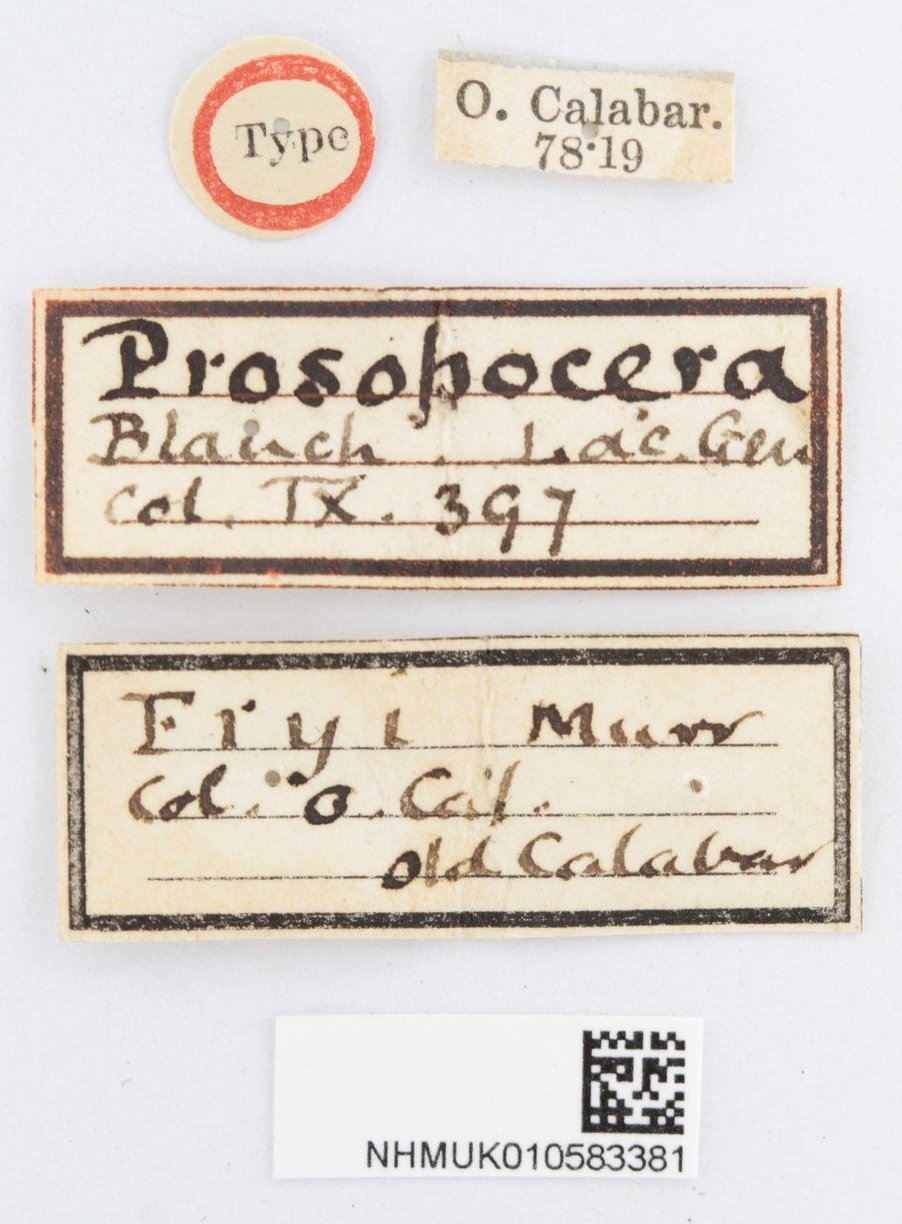 Specimen Type: syntype Sex: f Institution: BMNH British Museum Natural History, London, UK Photographer: Keita Matsumoto Collection Location: Old Calabar, Nigeria 65961