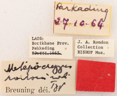 Metipocregyes rondoni Breuning Specimen Type: holotype Sex: m Institution: BPBM Bernice P. Bishop Museum, Honolulu, Hawaii, USA Photographer: Nobuo Ohbayashi Collection Location: Pakkading, Paksane, Laos 44700
