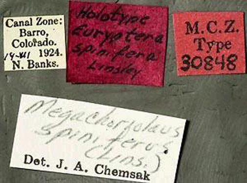 Euryptera spinifera Linsley Specimen Type: holotype Sex: f Institution: MCZ Museum of Comparative Zoology, Harvard University, Cambridge, MA, USA Collection Location: Barro Colorado Island, Panama 16637
