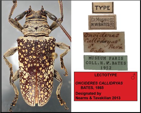Oncideres callidryas Bates Specimen Type: lectotype, syntype Institution: MNHN Museum of Natural History Paris, France Collection Location: banks of the Tapajos, Para, Brazil - Colombia 17775