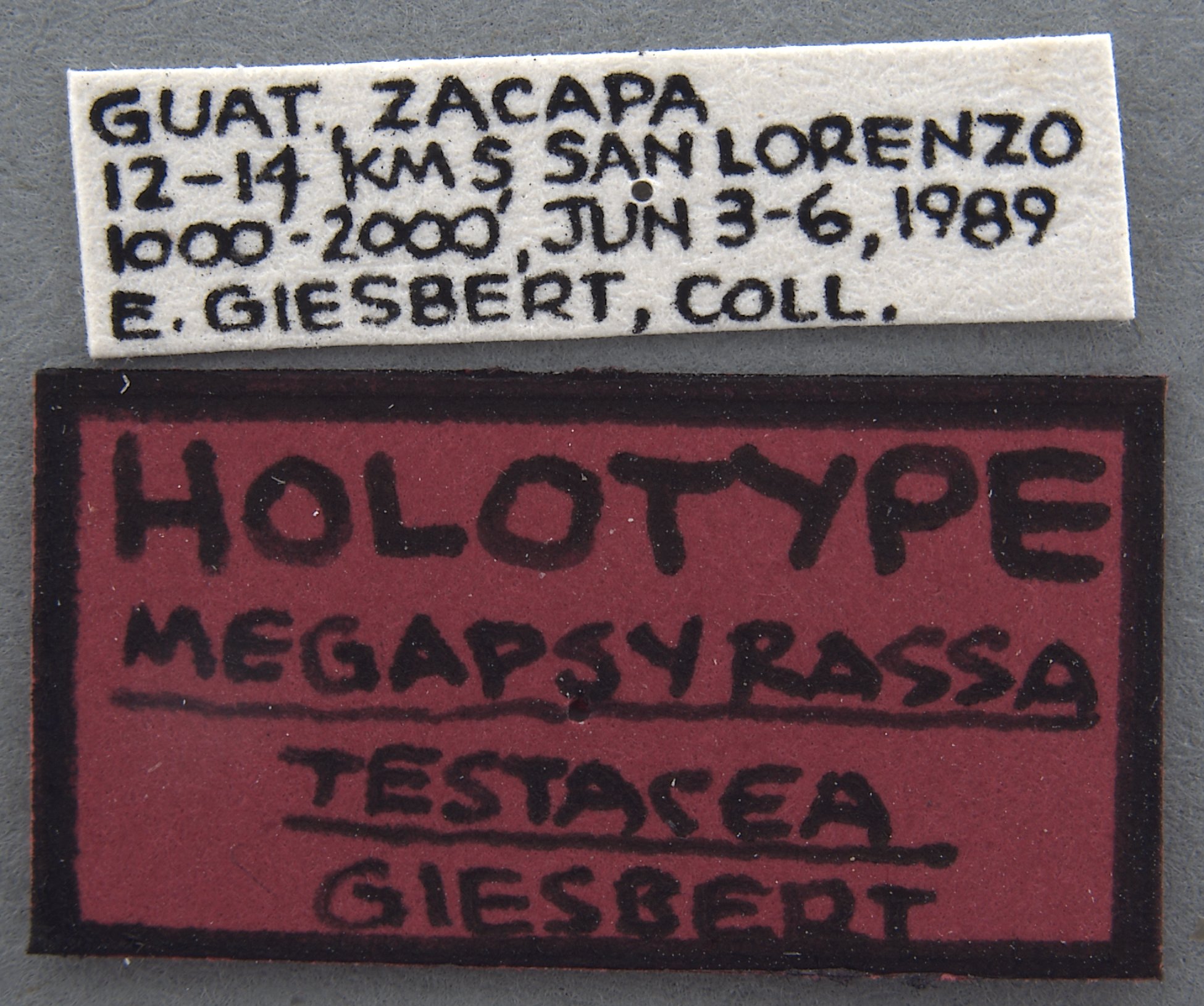 Megapsyrassa testacea Giesbert Specimen Type: holotype Sex: m Institution: CAS California Academy of Sciences, San Francisco, CA, USA Photographer: Rachel Diaz-Bastin Collection Location: 12-14 km S San Lorenzo, Zacapa, Guatemala 69360