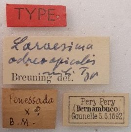 Laraesima ochreoapicalis Breuning Specimen Type: holotype Institution: MNHN Museum of Natural History Paris, France Photographer: JS Moure Collection Location: Periperi, Pernambuco, Brazil 78605