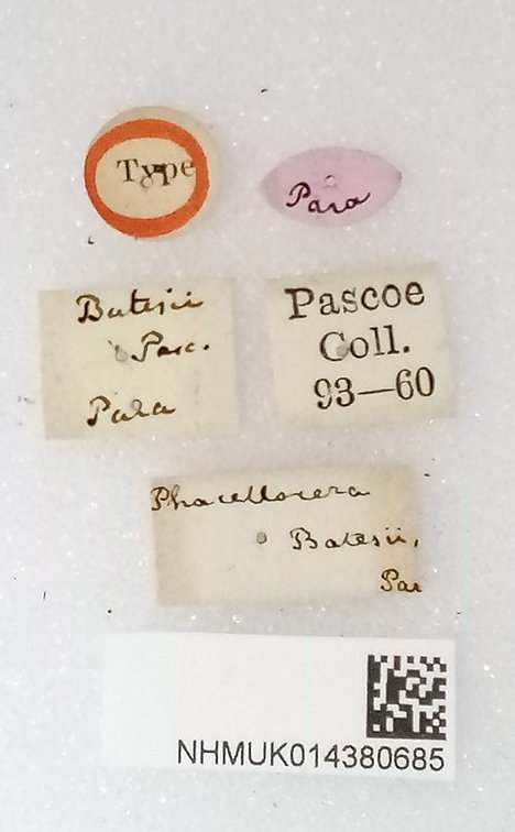 Phacellocera batesi Pascoe Specimen Type: holotype Institution: BMNH British Museum Natural History, London, UK Photographer: Keita Matsumoto Collection Location: Para, Brazil 75636